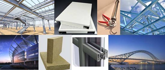 6. 建筑表皮與屋面:彩鋼板、搪瓷鋼板、鋁鎂錳板、鍍鋅板、烤瓷鋁板、氟碳鋁板、蜂窩鋁板、不銹鋼薄板、鋁(銅)及金屬復合板材、鍍鈦板、彩色涂層板等板材及屋面材料與配套設備等;