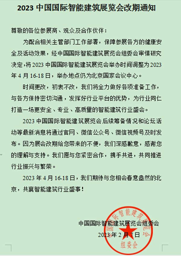 為配合相關主管部門工作部署,保障參展各方的健康安全及活動效果,經中國國際智能建筑展覽會組委會審慎研究決定,將2023中國國際智能建筑展覽會舉辦時間調整為2023年4月16-18日,舉辦地點仍為北京國家會議中心。