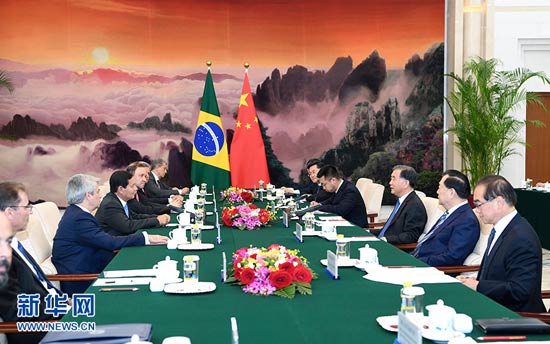 5月24日,全國政協(xié)主席汪洋在北京人民大會堂會見巴西副總統(tǒng)莫朗。 新華社記者 張領 攝