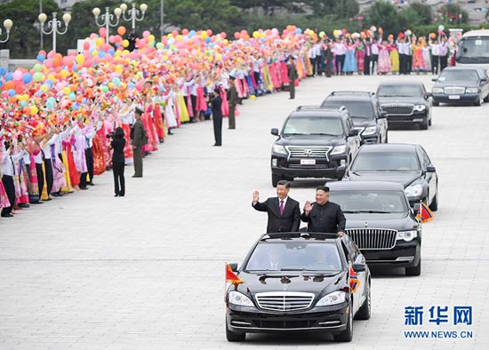 6月20日,中共中央總書記、國家主席習近平乘專機抵達平壤,開始對朝鮮民主主義人民共和國進行國事訪問。朝鮮勞動黨委員長、國務委員會委員長金正恩和夫人李雪主到機場熱情迎接習近平和夫人彭麗媛。朝方在機場舉行隆重歡迎儀式。歡迎儀式結束后,習近平與金正恩同車前往錦繡山太陽宮廣場,沿途數十萬群眾夾道歡迎。 新華社記者 申宏 攝