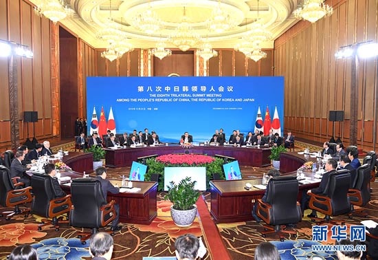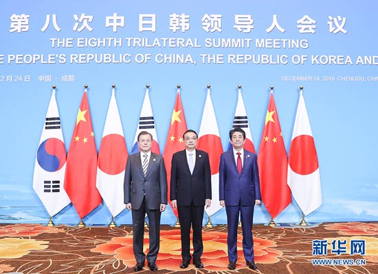 12月24日,國務院總理李克強在成都與韓國總統文在寅、日本首相安倍晉三共同出席第八次中日韓領導人會議。 新華社記者張領攝