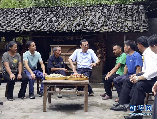 7月6日至7日,中共中央政治局常委、國務院總理李克強在貴州銅仁、貴陽考察。這是7月6日,李克強在銅仁掛扣村困難群眾家中了解災后糧食等生活保障情況。 新華社記者 劉衛兵 攝