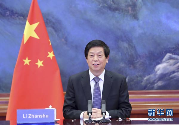 12月15日,全國人大常委會委員長栗戰書在北京人民大會堂以視頻方式同日本眾議長大島理森舉行會談。新華社記者 丁海濤 攝