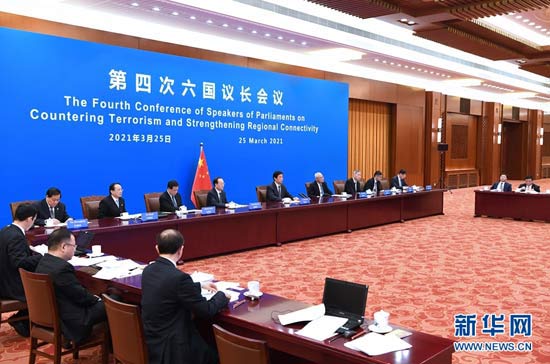 3月25日,全國人大常委會委員長栗戰書在北京人民大會堂以視頻方式出席第四次六國議長會議并發表講話。新華社記者 饒愛民 攝