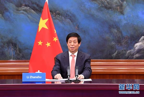 5月19日,全國人大常委會委員長栗戰(zhàn)書在北京人民大會堂以視頻方式同馬達加斯加國民議會議長克里斯蒂娜舉行會談。新華社記者 申宏 攝