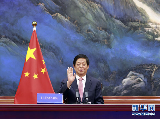 6月2日,全國人大常委會委員長栗戰(zhàn)書在北京人民大會堂以視頻方式同所羅門群島國民議會議長奧蒂舉行會談。新華社記者 丁林 攝