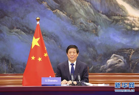 6月8日,全國人大常委會委員長栗戰書在北京人民大會堂以視頻方式同白俄羅斯國民會議共和國院主席科恰諾娃、代表院主席安德烈琴科舉行會談。新華社記者 黃敬文 攝