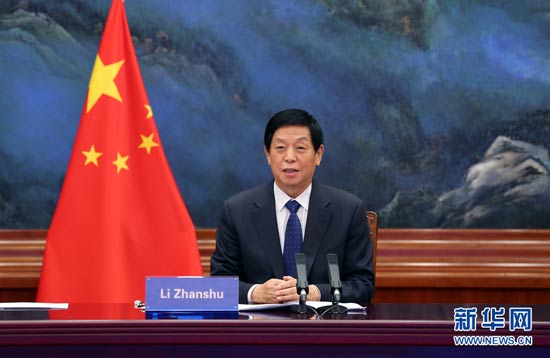 6月17日,全國人大常委會委員長栗戰書在北京人民大會堂以視頻方式同越南國會主席王庭惠舉行會談。新華社記者 姚大偉 攝