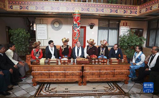 8月20日,中央代表團山南、日喀則分團帶著以習近平同志為核心的黨中央的深切關懷和全國人民的深情祝福,分別看望慰問當地各族各界干部群眾。這是中共中央書記處書記、中央統戰部部長、中央代表團副團長尤權率山南分團在山南市乃東區昌珠鎮扎西曲登社區走進居民次仁家看望慰問。新華社記者 丁林 攝