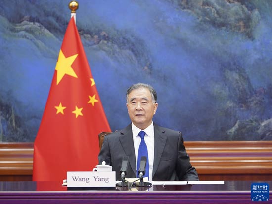 11月3日,全國政協主席汪洋在北京以視頻方式會見剛果(布)參議長恩戈洛。新華社記者 高潔 攝