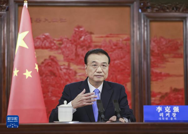 8月24日,國務院總理李克強在紀念中韓建交30周年商務合作論壇上發表視頻致辭。新華社記者丁林攝