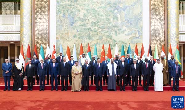5月30日上午,國家主席習近平在北京釣魚臺國賓館出席中阿合作論壇第十屆部長級會議開幕式并發表主旨講話。這是習近平同巴林國王哈馬德、埃及總統塞西、突尼斯總統賽義德、阿聯酋總統穆罕默德、阿盟秘書長蓋特以及22位阿拉伯國家代表團團長集體合影。新華社記者 黃敬文 攝