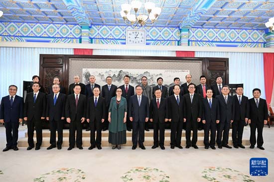 6月26日,中共中央政治局常委、國務院總理李強向新聘任的國務院參事劉實、常繼樂、李卓彬、尹中立、盧琦、張平、劉衛東和中央文史研究館館員孫曉云、張平、趙汀陽、榮新江、萬建中頒發聘書。這是頒發聘書后,李強同大家合影留念。新華社記者 饒愛民 攝