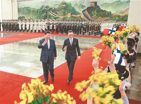 習近平指出,芬蘭是最早一批同新中國建交的西方國家之一,也是第一個同中國簽訂政府間貿易協定的西方國家。建交以來,中芬始終友好相處、互尊互信,樹立了國與國之間超越歷史、文化、制度差異,平等交往的典范。當前,世界百年變局加速演進,人類社會面臨的風險挑戰增多。在此背景下,中芬面向未來的新型合作伙伴關系更顯獨特價值,值得倍加珍惜和發揚光大。中方愿同芬方一道,加強戰略合作,弘揚友好傳統,將中芬面向未來的新型合作伙伴關系進一步推向前進,更好造福兩國和兩國人民,為世界和平和發展作出新貢獻。