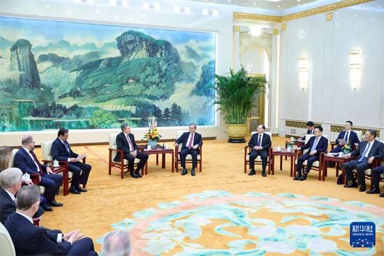 3月23日下午,國務院總理李強在北京人民大會堂會見來華出席中國發展高層論壇2025年年會的美國聯邦參議員戴安斯及部分美國企業界人士。